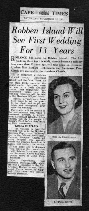 My parents, Barbara Ueckermann & Peter Klerck met on Robben Island just after the war for the first time, and then married there in 1952...